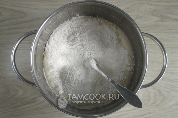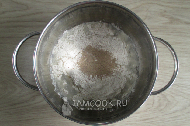 Для приготовления опары воду комнатной температуры соедините с мукой (100 г), перемешанной с дрожжами и сахаром (20-25 г).