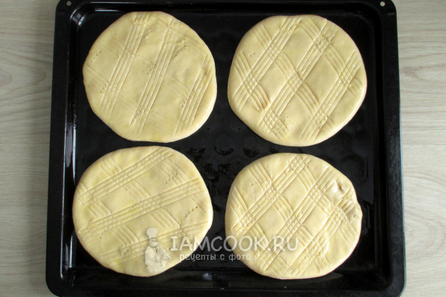 Уложите лепешки швом на смазанный противень. Смажьте их поверхность желтком, сделайте проколы для выхода пара вилкой или зубочистками. Для оформления традиционно используется специальная печать, а если её нету, то нанесите простые узоры вилкой... Расстойку делать не нужно, сразу пеките.