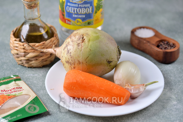 Возьмите необходимые продукты для приготовления салата из редьки по-корейски и моркови.