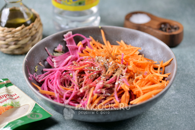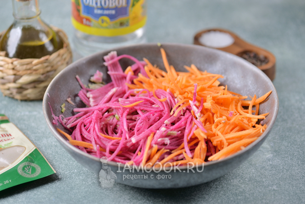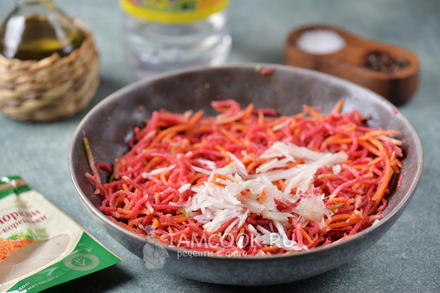 На специальной терке натрите редьку с морковью тонкой соломкой, сложите в глубокую миску.
