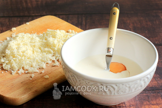Подготовьте заливку. Для этого смешайте сливки (сметану) с яйцом, солью и специями. Хорошенько взбейте вилкой до объединения. Моцареллу натрите на терке и добавьте к заливке.