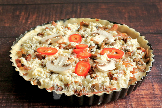 Залейте подготовленной заливкой на основе сливок, яйца и сыра. Несколько ярких вкраплений перца для украшения. Выпекайте киш с ветчиной и грибами в разогретой до 180 градусов духовке 20-30 минут, на среднем уровне. Время регулируйте по своей духовке. У меня пирог был готов через 20 минут.