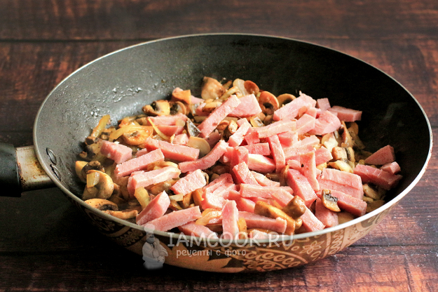 Добавьте нарезанную соломкой ветчину и еще все вместе обжарьте минуты три. Затем начинку выложите на блюдо и остудите.