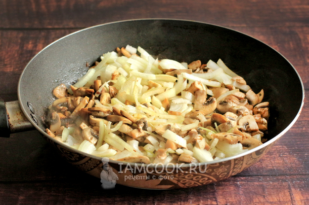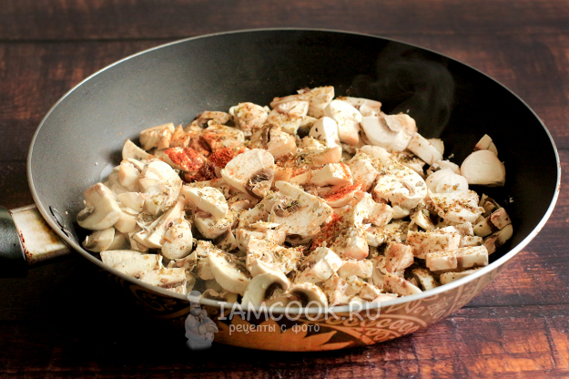 На сухой сковороде обжарьте нарезанные грибы, чтобы из них вышла вся жидкость. Обязательно посолите и посыпьте специями, так как грибы сразу впитывают их в себя.