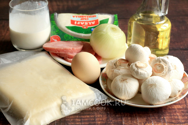 Чтобы приготовить киш с ветчиной и грибами, нам понадобятся все продукты по списку. Слоеное тесто заранее разморозьте.