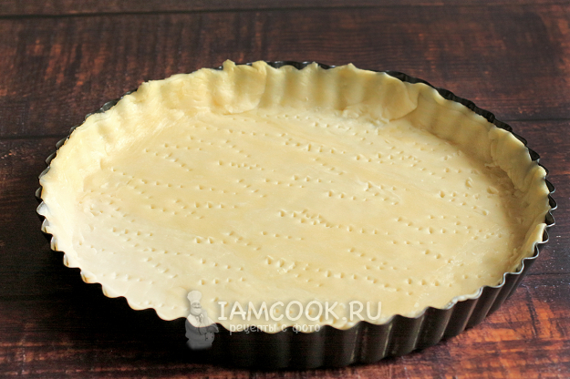 Форму слегка смажьте растительным маслом. Тесто раскатайте и поместите в форму, дно которой наколите вилкой. Основу можно подпечь в духовке минут 7, но можно и не заморачиваться.