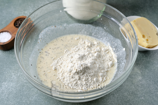 Всыпьте пшеничную муку, продолжайте взбивать.