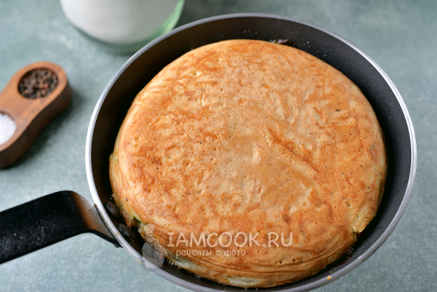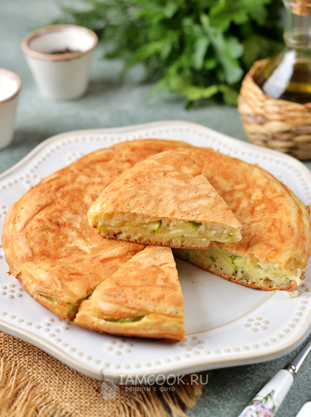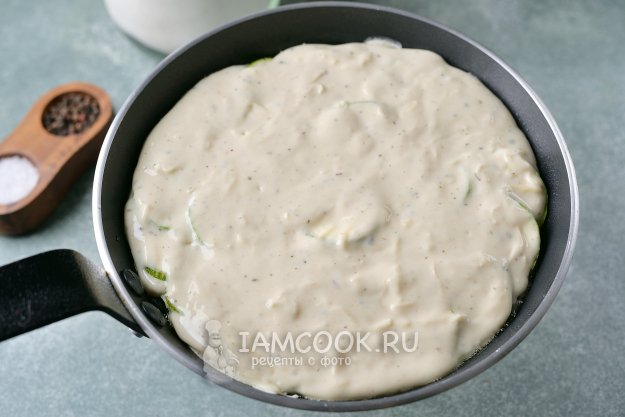 Аккуратно переверните пирог на другую сторону и продолжайте выпекать заливной пирог из кабачков на сковороде еще 15 минут.