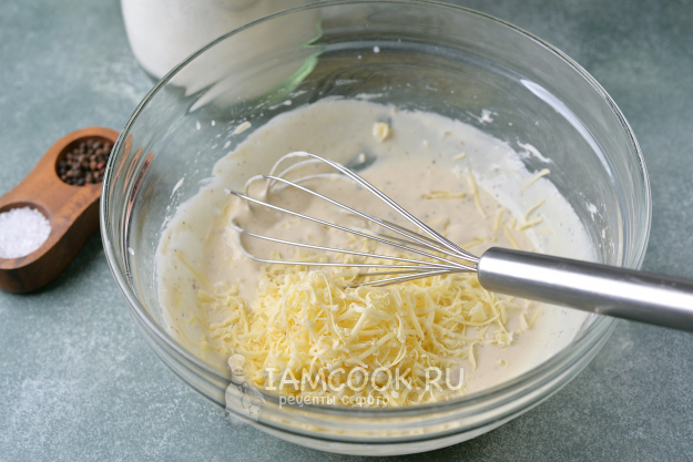 Добавьте натертый на мелкой терке твердый сыр, смешайте все.