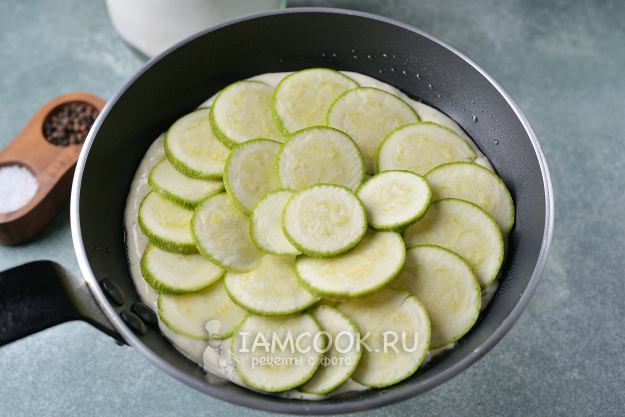 Сковороду смажьте растительным маслом, слегка разогрейте на тихом огне. Вылейте на нее половину теста, выложите кружочки кабачка слегка внахлест.