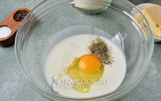 Влейте в глубокую миску нежирный кефир, вбейте яйцо, всыпьте щепоть соли, соду и орегано, взбейте все венчиком до однородности.