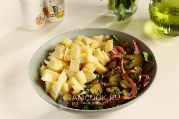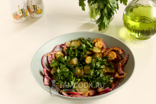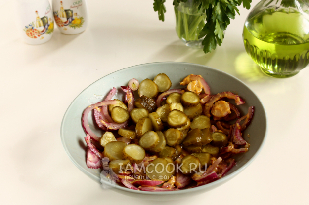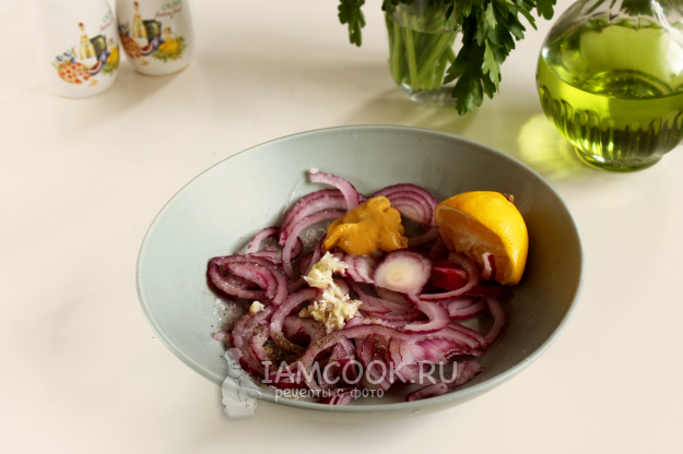 Лук красных сортов нашинкуйте тонкими полукольцами, добавьте натертый мелко чесночный зубок, горчицу, сок лимона или винный уксус, соль, черный перец. Перемешайте. За время сборки салата лук успеет промариноваться.
