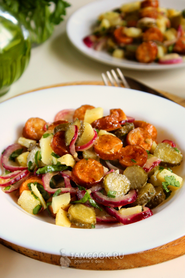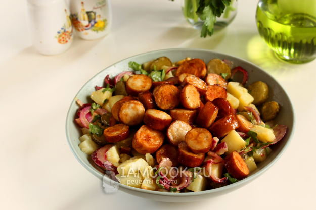 Быстро перемешайте все компоненты, снимите пробу (на специи), разложите по порциям и подавайте к столу баварский салат теплым. Надо сказать, аппетитным салат остается и в остуженном варианте.
