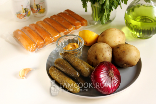 Для приготовления теплого баварского салата (с баварскими колбасками и картофелем) возьмите продукты по списку. Удобно картофель отварить заранее, потом дополнительно прогреть.