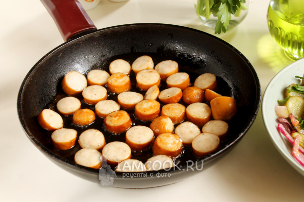 На растительном масле до золотистой корочки обжарьте кружки баварских колбасок (с двух сторон).