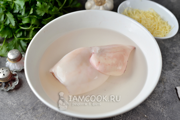 Кальмара залейте кипятком, промойте его под проточной водой, удалите хитиновую жилку и внутренности, если есть.