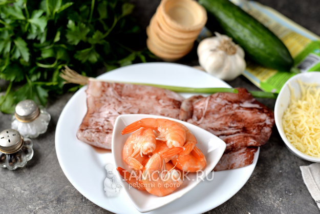 Возьмите все необходимые продукты для приготовления салата с креветками и кальмарами в тарталетках. Кальмара и креветок предварительно разморозьте, помойте огурец, лук и чеснок, натрите твердый сыр.