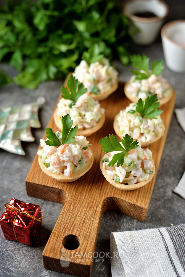Салат с креветками и кальмарами в тарталетках готов. Отличная фуршетная закуска.