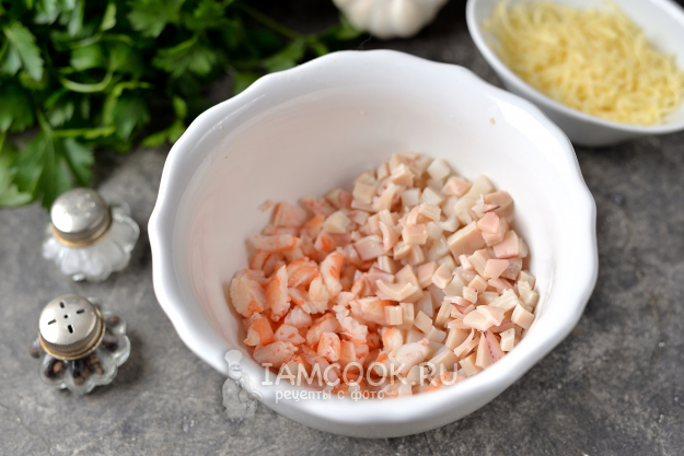 Очистите креветочные хвосты от панциря, удалите кишечник, нарежьте мелко морепродукты, сложите в глубокую миску.