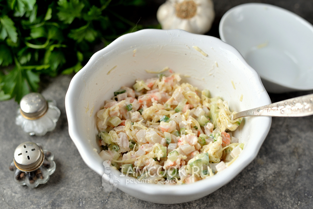 Поперчите и посолите салат, заправьте майонезом хорошего качества, перемешайте.