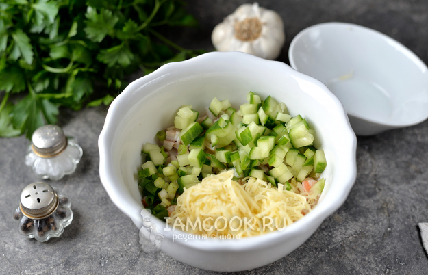 Добавьте к морепродуктам нарезанные огурцы, зеленый лук и чеснок, натертый сыр. При желании в начинку еще можно положить вареное яйцо, если хотите сделать салат сытнее.