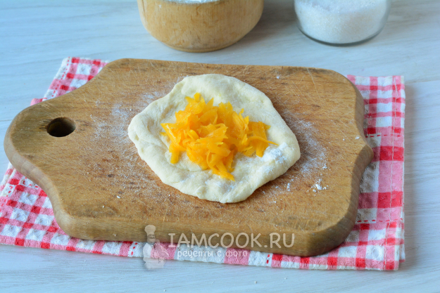 Разделите тесто на небольшие шарики, раскатайте и в центр выложите 1-1,5 ч.л. остывшей тыквенной начинки.