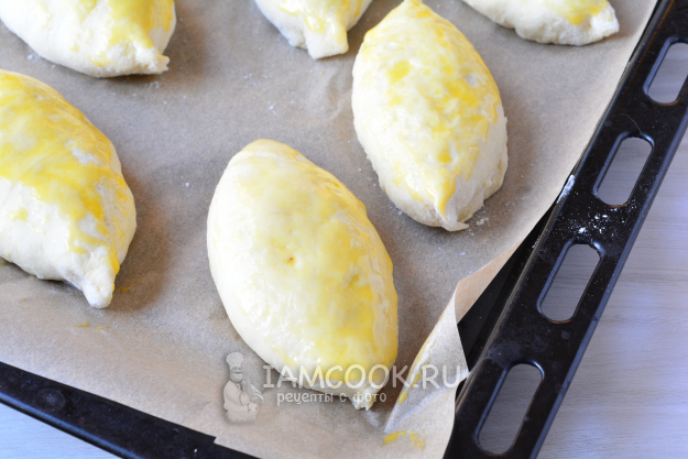 Таким образом слепите все пирожки, выложите на противень на расстойку на 15 минут. Пирожки еще немного поднимутся и тесто подойдет. Затем пирожки смажьте взбитым яйцом.
