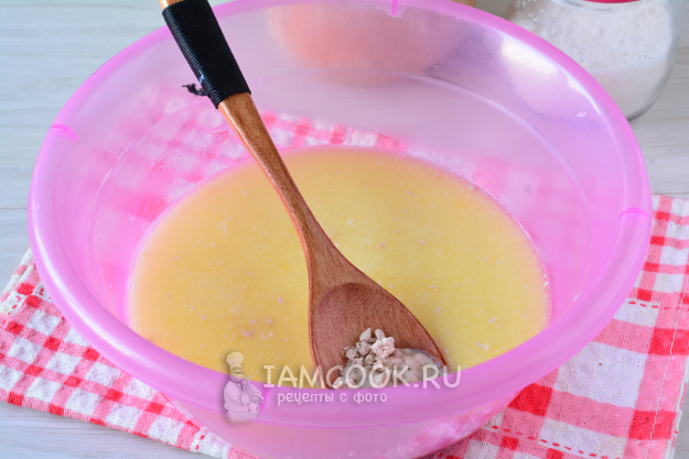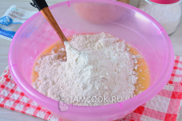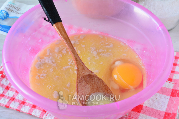 Тесто размешайте, всыпьте ванильный сахар и вбейте 1 куриное яйцо, снова размешайте до однородности.