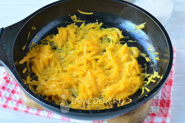 Тыкву почистите и натрите на крупной терке. Тушите тыкву с сахаром на сковороде со сливочным маслом 15-20 минут, до мягкости.