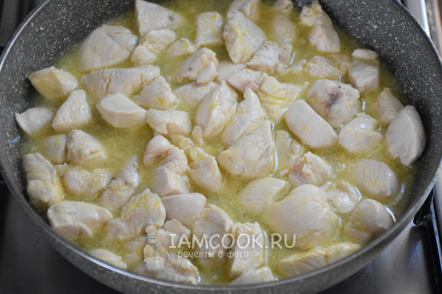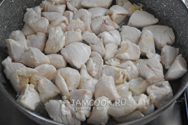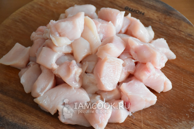 Куриное филе промыть под проточной водой, обсушить бумажным полотенцем и нарезать небольшими кусочками.