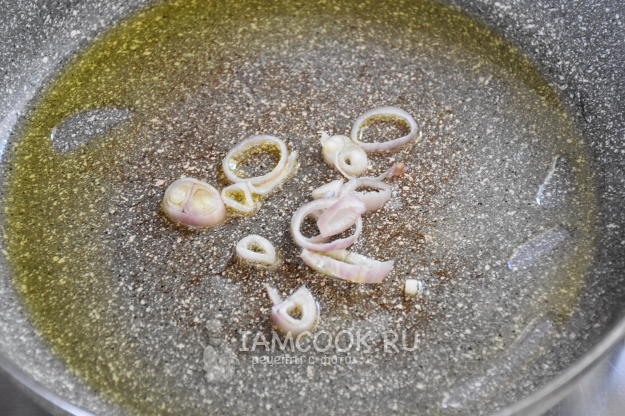 Лук-шалот почистить и нарезать колечками. В глубокой сковороде разогреть оливковое масло и обжарить лук до мягкости.