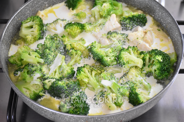 Добавить брокколи, влить сливки, перемешать и готовить 15 минут.