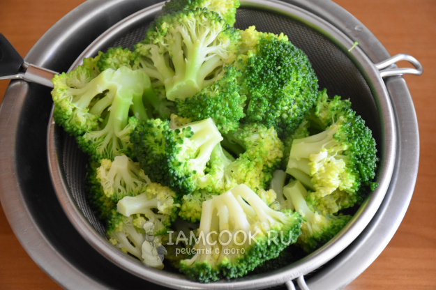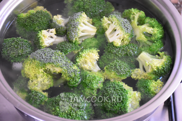 Брокколи промыть под проточной водой, разделить на соцветия и отварить в кипящей подсоленной воде 5 минут.