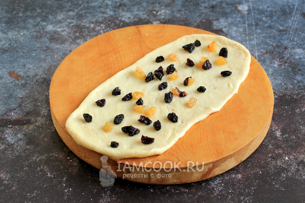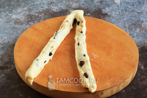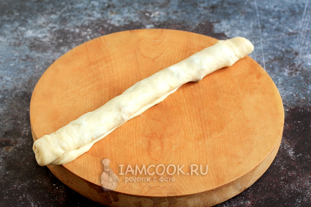 Разрежьте рулет вдоль на две части, не дорезая пару см вверху. Эти 2 см приплющите скалкой к столу, чтобы проще было формировать косичку и она никуда не убегала. Скрутите два жгутика между собой в косичку, разрезами кверху, а оставшийся кончик теста тоже приплюсните скалкой, чтобы он стал плоским и легко прятался внутрь.