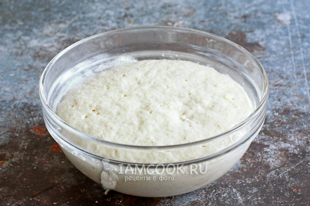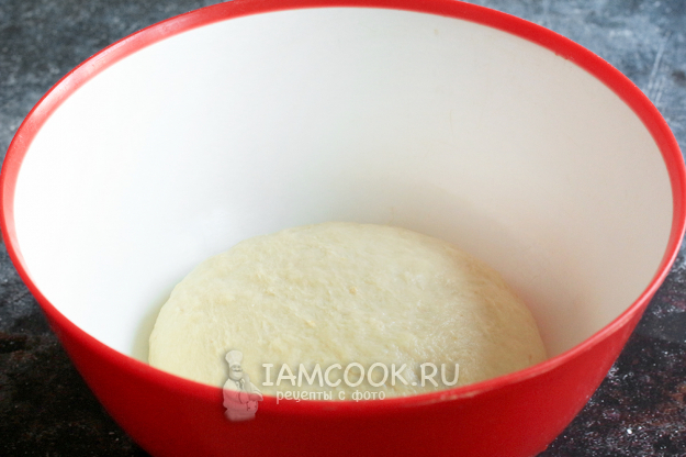 Миску смажьте растительным маслом и поместите в нее тесто для расстойки. Емкость накройте пленкой и поставьте в теплое место. Тесто должно увеличиться в объеме раза в три.