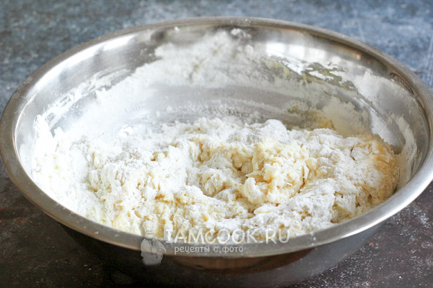 Постепенно подсыпайте муку и замешивайте тесто ложкой. Когда ложка перестанет справляться, то выложите тесто на стол, присыпанный мукой, и замесите мягкое тесто.