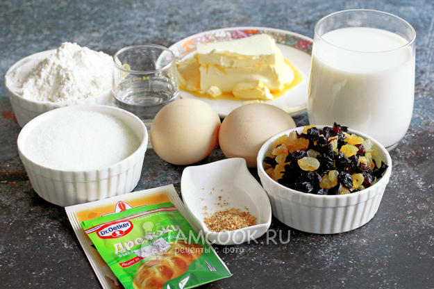 Чтобы приготовить ароматные плюшки с изюмом на дрожжевом тесте (с молоком) возьмите всё необходимое по списку выше. Изюм промойте в кипятке и залейте ликером. Все продукты должны быть комнатной температуры.