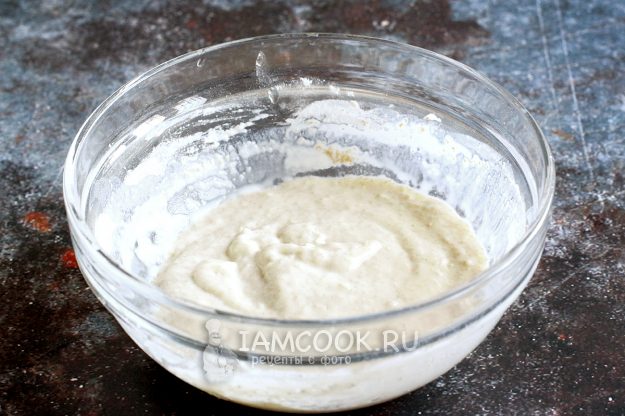 Сделайте опару. Для этого сухие дрожжи смешайте с парой ложек муки, добавьте половину теплого молока с чайной ложкой сахара и размешайте все ложкой до гладкого состояния. Если покажется, что жидко, добавьте еще немного муки, если покажется, что густо, добавьте немного молока. Здесь не важны точные пропорции, просто надо заставить работать дрожжи. Густота теста - как на оладьи. Накройте миску пленкой и поставьте в теплое место для подъема.