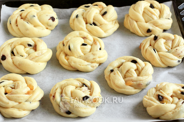 Выложите булочки на противень, выстланный антипригарным пергаментом, или смажьте противень маслом. Оставьте плюшки в теплом месте еще на полчаса для подъема.