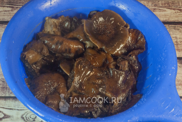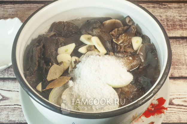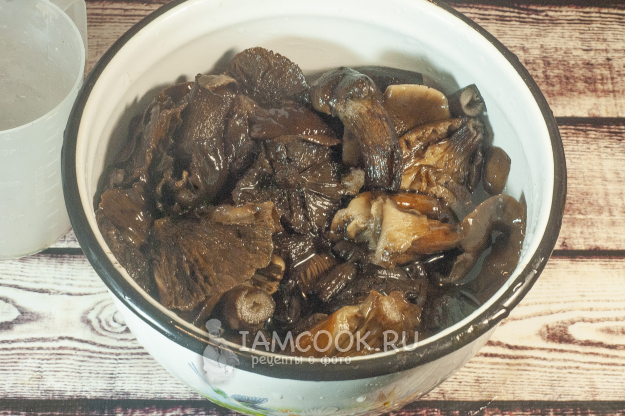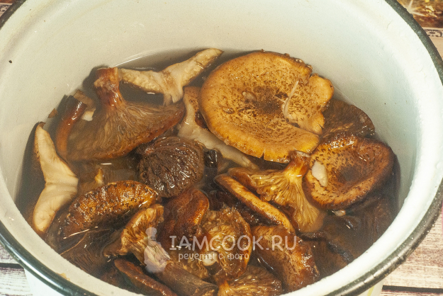 Грибы сложим в эмалированную кастрюлю, зальем водой для маринада.