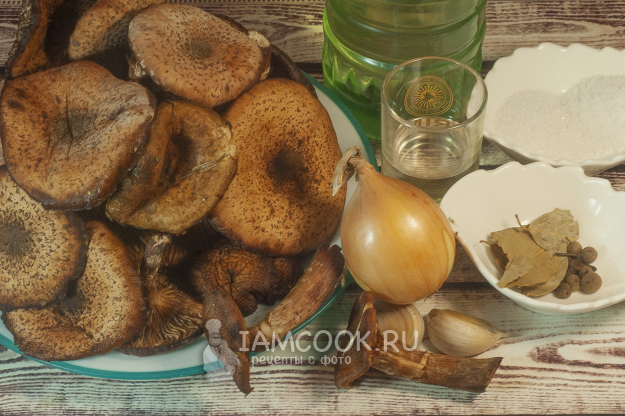 Подготовим ингредиенты для заготовки маринованных опят с луком и маслом на зиму.