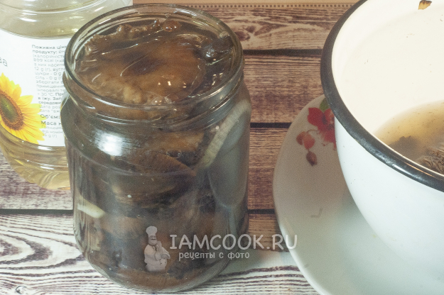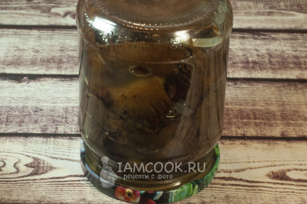 Грибы раскладываем в простерилизованные банки вместе с маринадом, луком и чесноком. Сверху в каждую банку наливаем столовую ложку подсолнечного масла.