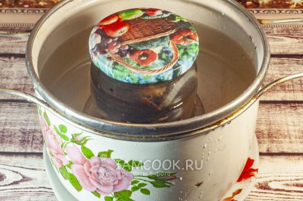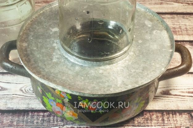 Банки прикрываем стерильной крышкой и ставим в кастрюлю с водой на подставку для стерилизации. Вода в кастрюле должна быть теплой, чтобы не лопнула банка от разницы температур. Стерилизуем с момента закипания 30 минут при слабом кипении.