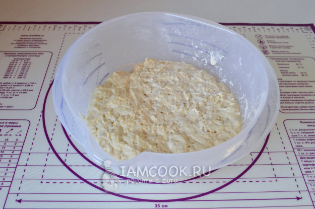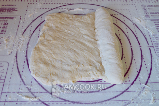 Утром достать миску с тестом из холодильника, дать постоять при комнатной температуре 30-60 мин. Затем выложить на присыпанную мукой рабочую поверхность, сверху присыпать мукой. Растянуть тесто в прямоугольник и завернуть в рулет, закрепляя каждый виток.