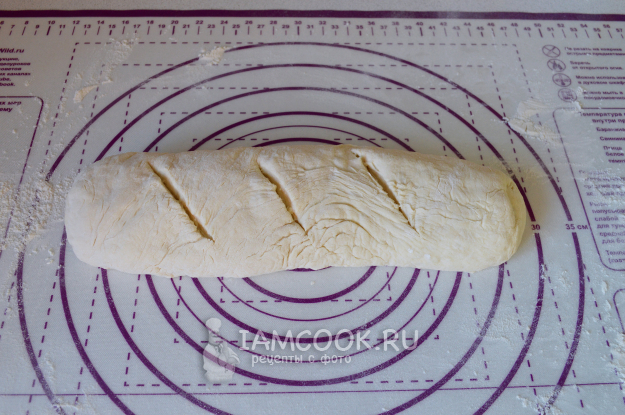 Хорошо закрепить шов изделия и немного подкатать. Сделать на заготовке глубокие надрезы, присыпать поверхность мукой.