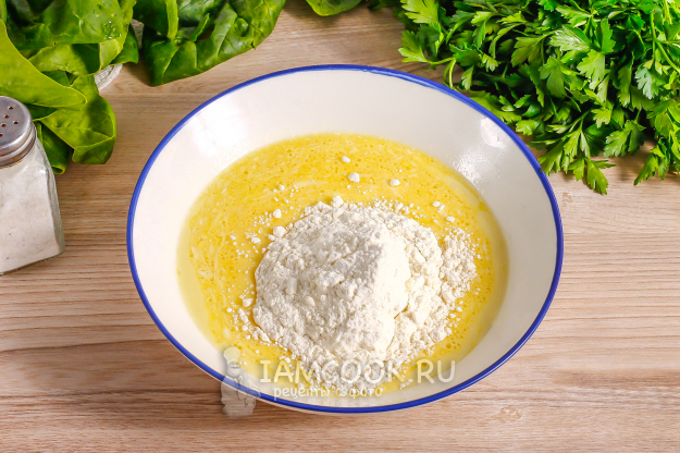 Всыпьте пшеничную муку высшего сорта и вмешайте ее аккуратными движениями. Разрыхлитель не добавляйте, тесто не должно быть воздушным.