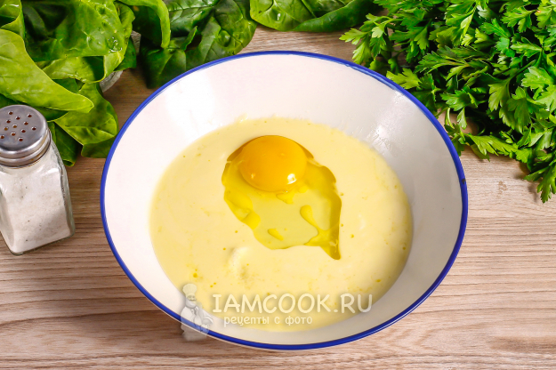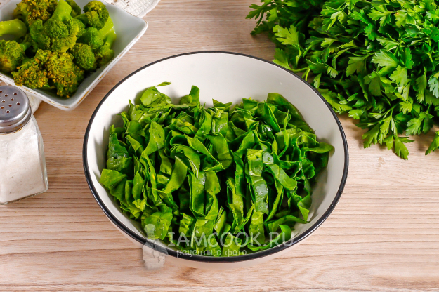 Промойте листья шпината, срезав стебли. Стряхните лишнюю влагу и нарежьте их лентами. Перемешайте с начинкой.