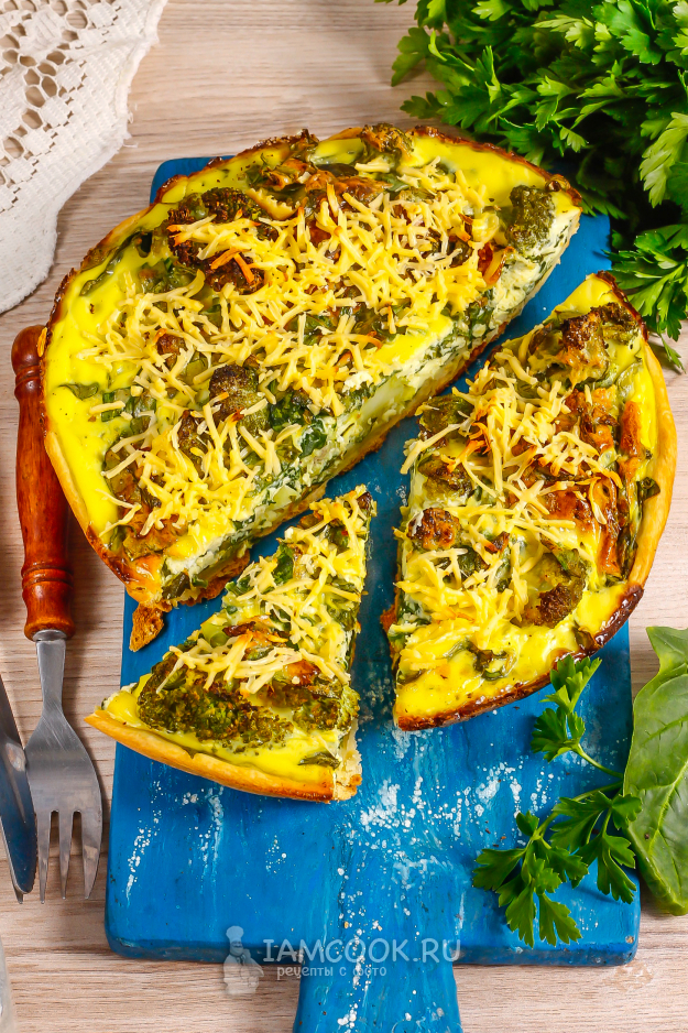 Разогрейте духовку до 180 градусов. Выложите в форму тесто и распределите его руками по дну, заходя и на бортики. В середину выложите начинку и соцветия брокколи. Старайтесь «утопить» брокколи в начинке, чтобы соцветия не подгорели и чтобы их не было видно. Поместите форму в духовку на 40-45 минут на средний уровень. В самом конце выпекания можно присыпать пирог оставшейся сырной массой.