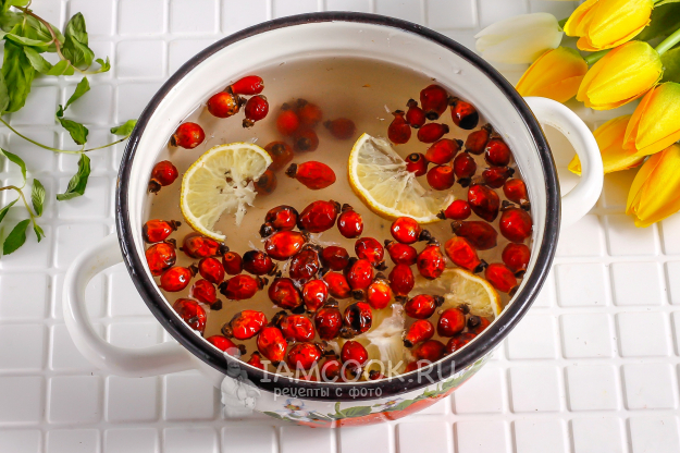 Компот из шиповника получится не слишком ароматным, но его польза с лихвой компенсирует эту потерю. Вкусный напиток обладает противовоспалительным действием, повышает способность организма сопротивляться ОРВИ и простудам и укрепляет иммунитет. Поэтому обязательно приобретите или соберите шиповник после первых заморозков. Главное, не варите долго компот, чтобы не разрушить витамин C в нем. Сахар добавляйте по своему вкусу, а можно приготовить напиток вообще без него, заменив его медом в самом конце, когда компот остынет до 30 градусов.