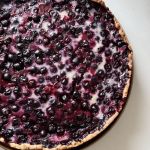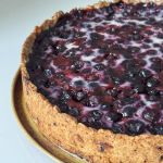 Форму с тестом достать из морозилки. Ориентировочно форма должна простоять там около 20 минут. Влить заливку в форму и сверху высыпать смородину, стараясь распределить её равномерно.